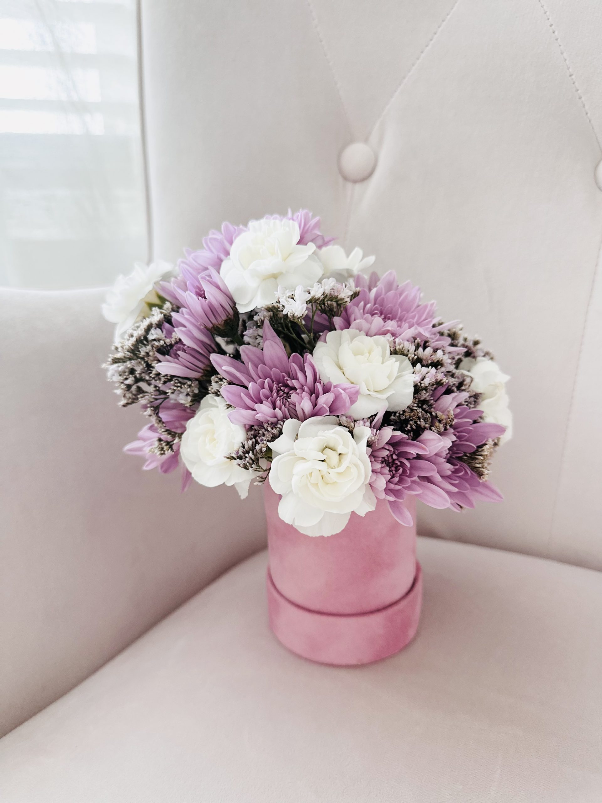 Discover the charm of our Petite Beauty, a graceful arrangement that radiates elegance in every bloom. Filled with carnations, soft chrysanthemums, and an assortment of other handpicked seasonal flowers, this petite box is perfect for adding a touch of floral cheer to any occasion.